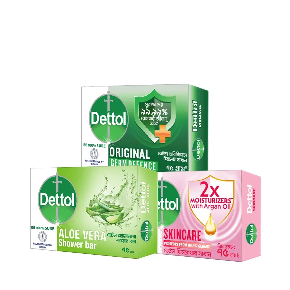Dettol Soap Family Pack — এই প্যাকেটটিতে রয়েছে একসাথে ৩টি (৭৫ গ্রাম প্রতিটি) সোপ‑বার, যার মধ্যে রয়েছে: Skincare, Aloe Vera ও Original ভ্যারিয়েন্ট।