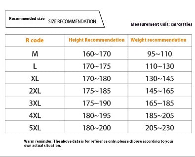 Size: M (47.50kg-55.00kg,L (55.00kg-65.00kg,XL (65.00kg-72.50kg,2XL (72.50kg-82.50kg,3XL (82.50kg-92.50kg, 4XL (92.50kg-102.50kg, 5XL (102.50kg-115.00kg)